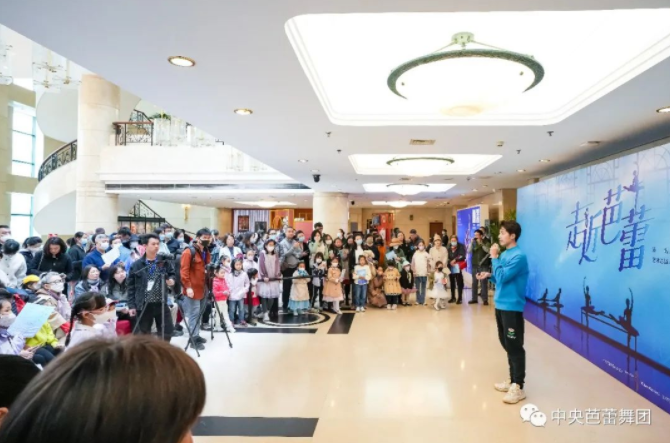 演出开始前,中芭艺术教育部的张眺在剧场前厅主持了“芭蕾沙龙”活动,为大家生动讲解了芭蕾知识并带领现场小朋友们尝试了几个简单的基础动作。