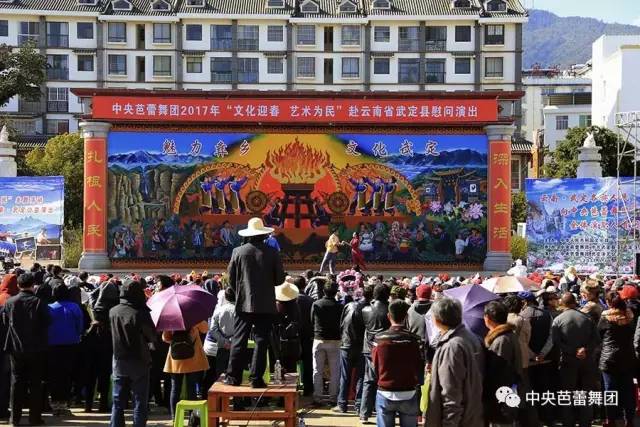 情系基层暖人心、德艺双馨舞新篇,为了认真贯彻落实中央“深入生活、扎根人民”的创作、演出指示精神,促进边疆地区和内地相互交流、学习,丰富当地群众精神文化生活,在2017年1月17日,中芭迎春慰问演出团队一行70余人,带着党和国家的关心、关怀,带着艺术家们真诚的祝愿,来到了云南省楚雄彝族自治州武定县,为武定地区的各族人民带来了一台“2017年‘文化迎春、艺术为民’”慰问演出。