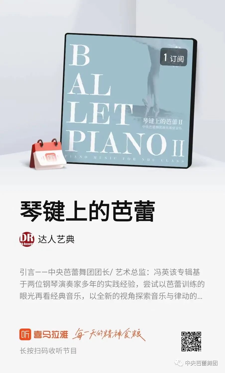 在广泛开展芭蕾美育的今天,越来越多的各年龄段人愿意走进芭蕾,成为热爱芭蕾的一名观众、学习者。本专辑制作人的初衷就是希望能够为芭蕾专业舞者、学生乃至非专业的芭蕾爱好者提供更加丰富、灵动的课堂音乐。另外,在此基础上,为钢琴专业学生打开视野,为芭蕾舞者更好理解交响乐打下基础,音乐和舞蹈都是无国界并跨年龄的艺术,能够传递人与人之间的情感和人对外界的感受,是人与人,人与外界很好的桥梁。希望通过这个专辑能够连接起更多音乐舞蹈爱好者,一起“载歌载舞”!